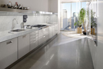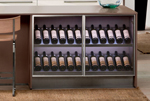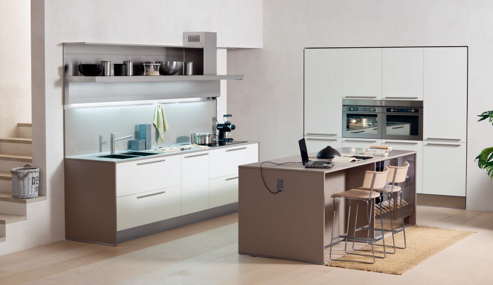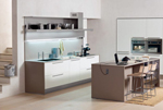 Laevia is sold with doors of white Satin layered wood or with Decor Light and Decor Grey finishing, while surfaces are made of Satin Titan layered wood. Two innovations are the practical light profile with stainless steel finishing and a Wine Rack under thecorner top.